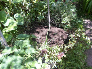 Al final corte y pique todo tipo de hojas, pastos plantas aromáticas, y una hiedra (Parthenocissus o algo así). Y lo pique con la tijera, y puse una capa de rastrojos o mulching. No regue por ahora, a la tarde le voy una regada.